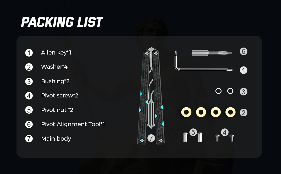 The blade is made of 440C steel with a hardness of around 59HRC, much higher than 420C steel. There are two pivot screws and bushings at the end of its handles, serving as counterweights. These allow you to adjust the balance of the balisong trainer by about 2mm.