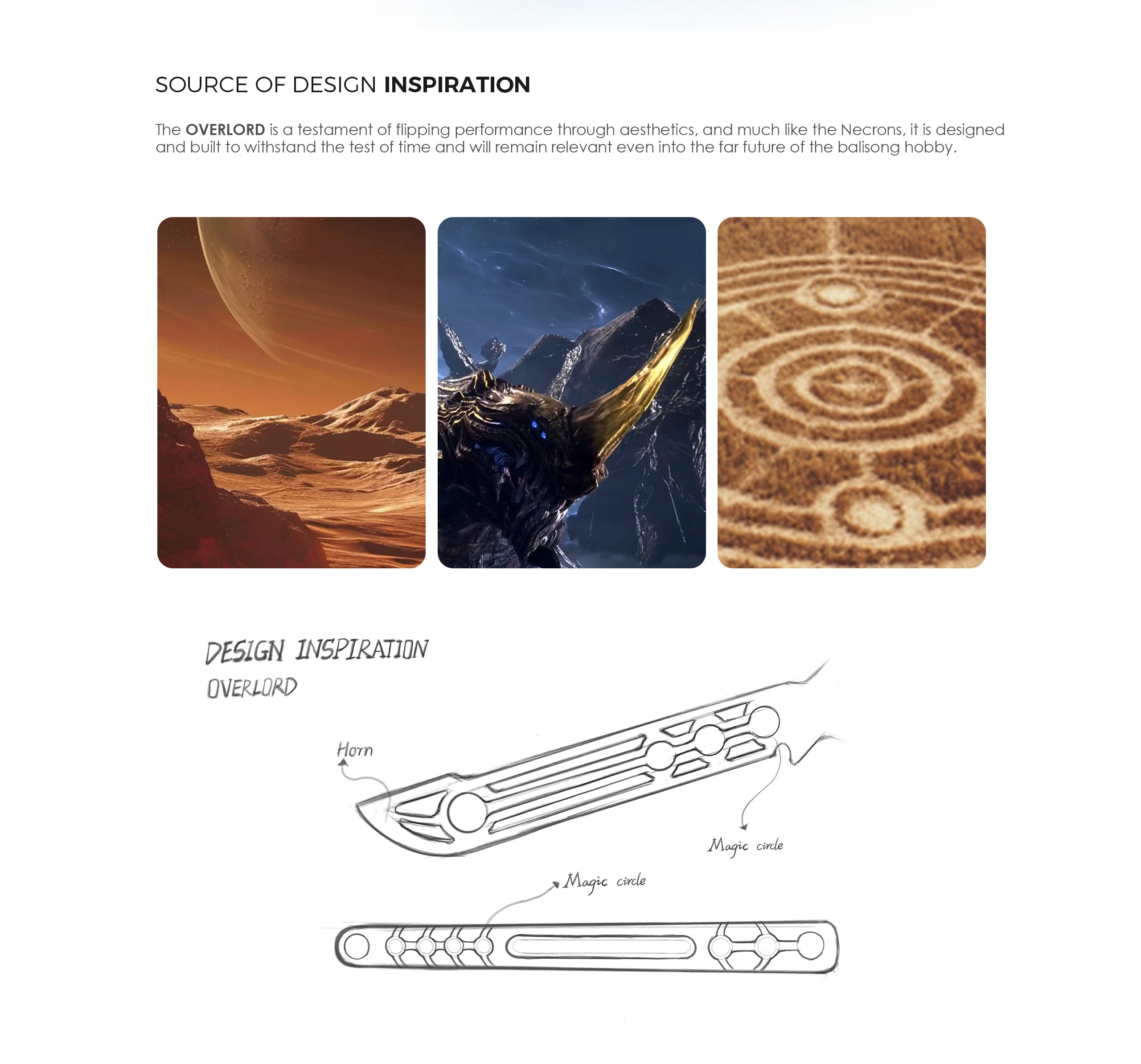 The goal of the OVERLORD was to create a balisong with a distinct extraterrestrial theme that blends the otherworldly aesthetics into its balance and flipping performance through form and function.