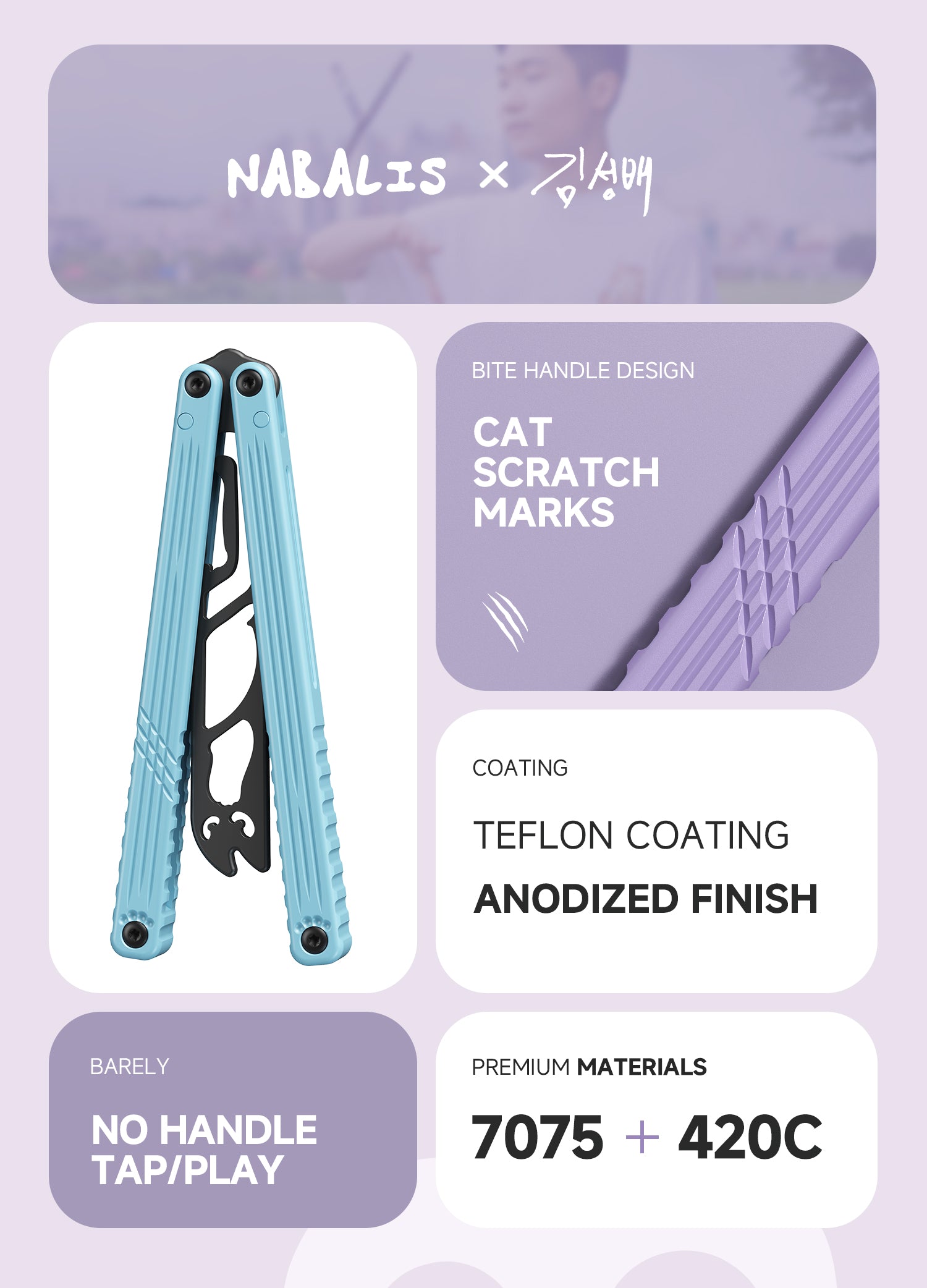The CAT Balisong is a special collaboration between Seongbae and Nabalis, combining precise craftsmanship with unique design. Upgraded with aerospace-grade 7075 aluminum handles and paired with a durable 420 stainless steel blade, smooth flipping, and excellent balance. The channel handle construction and latchless design ensure comfortable control with every flip. With a neutral-to-light handle bias suitable for various flipping styles, the CAT is both safe and playful — perfect as a collectible or for pure flipping enjoyment. More than just a knife, the CAT embodies Seongbae’s vision of a “Holy Grail” for every balisong enthusiast.